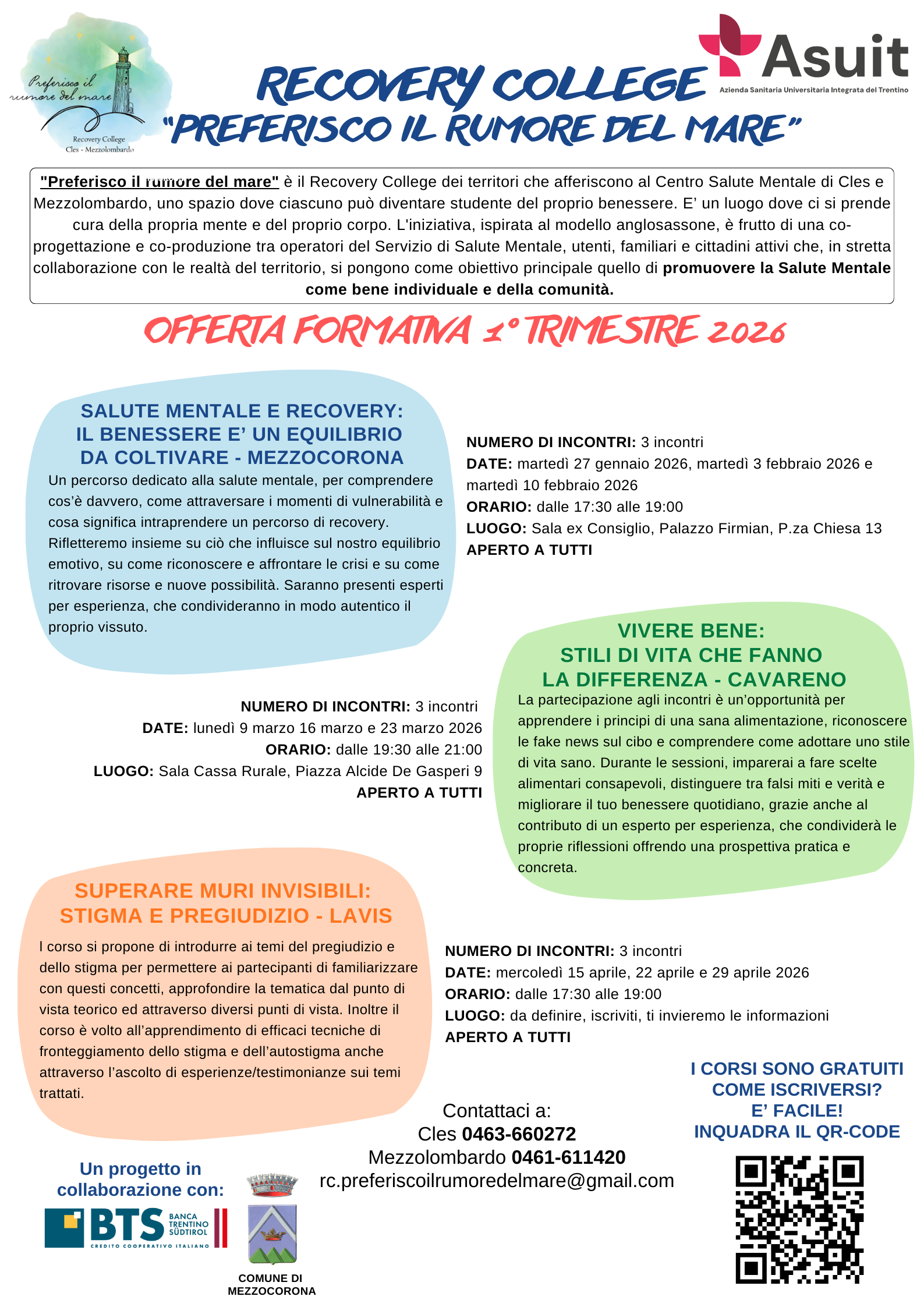 Gli incontri si svolgono all’interno delle attività del Recovery College, uno spazio progettato e sostenuto dagli operatori del Centro di Salute Mentale di Cles e Mezzolombardo, aperto alla comunità che promuove il benessere mentale e fisico attraverso momenti di confronto, apprendimento e condivisione.